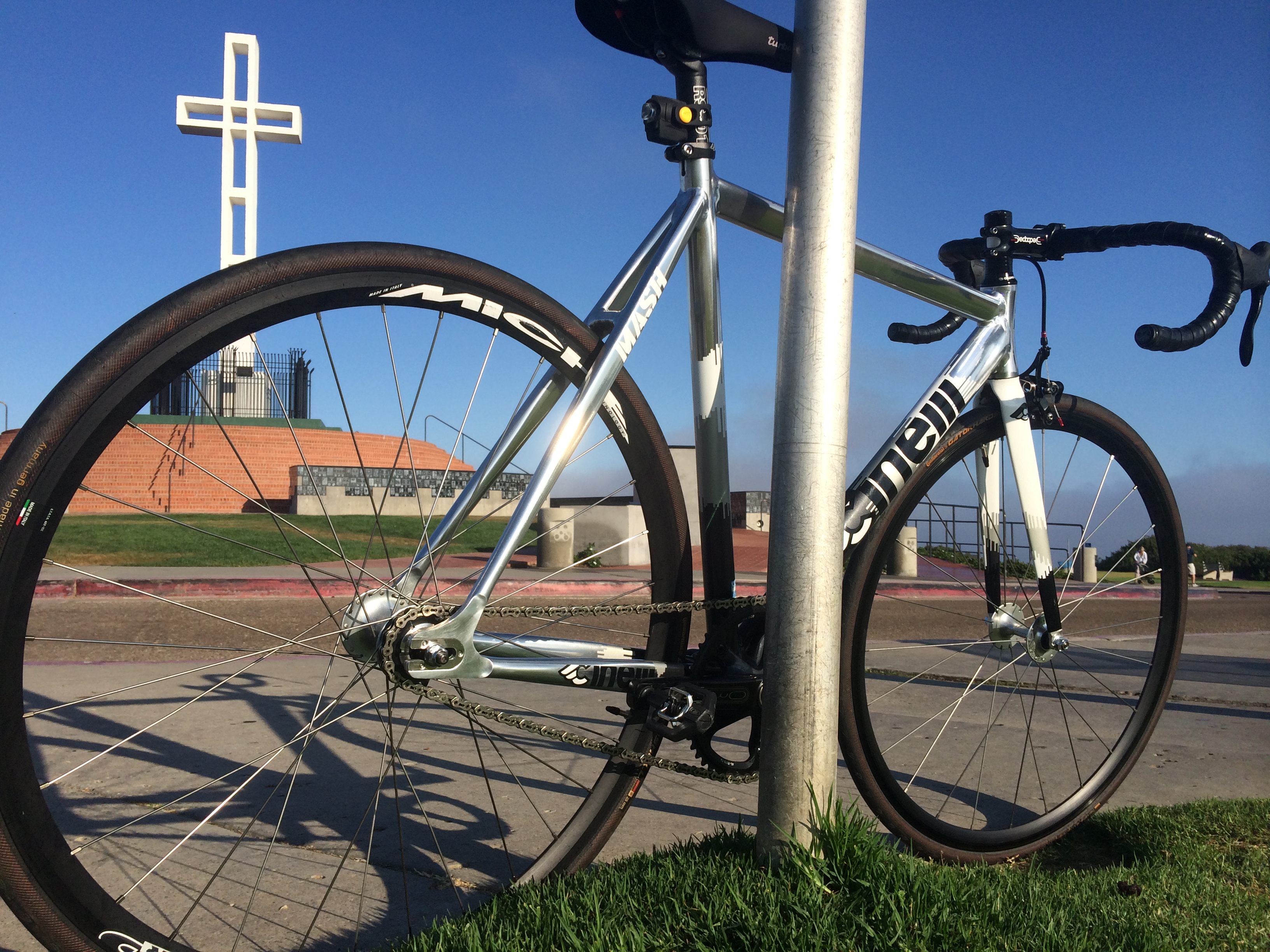 I joined the Gitman-Holland club ride up Kitchen Creek to Mt. Laguna, just to see if I could do it on my Cinelli fixed 48×16. The answer is, “yes, but it hurts”. The ride covered 93km, with 1800m of vertical climbing. The main Kitchen Creek climb was 21km with typical 5% – 6% gradient hills, and a 0.8km section @ 11%. Ouch. I hung with the guys for the first 15km of climbing, then finished up at my own pace. We all re-grouped at the store on the top of the climb, and everyone gave me kudos for the effort.