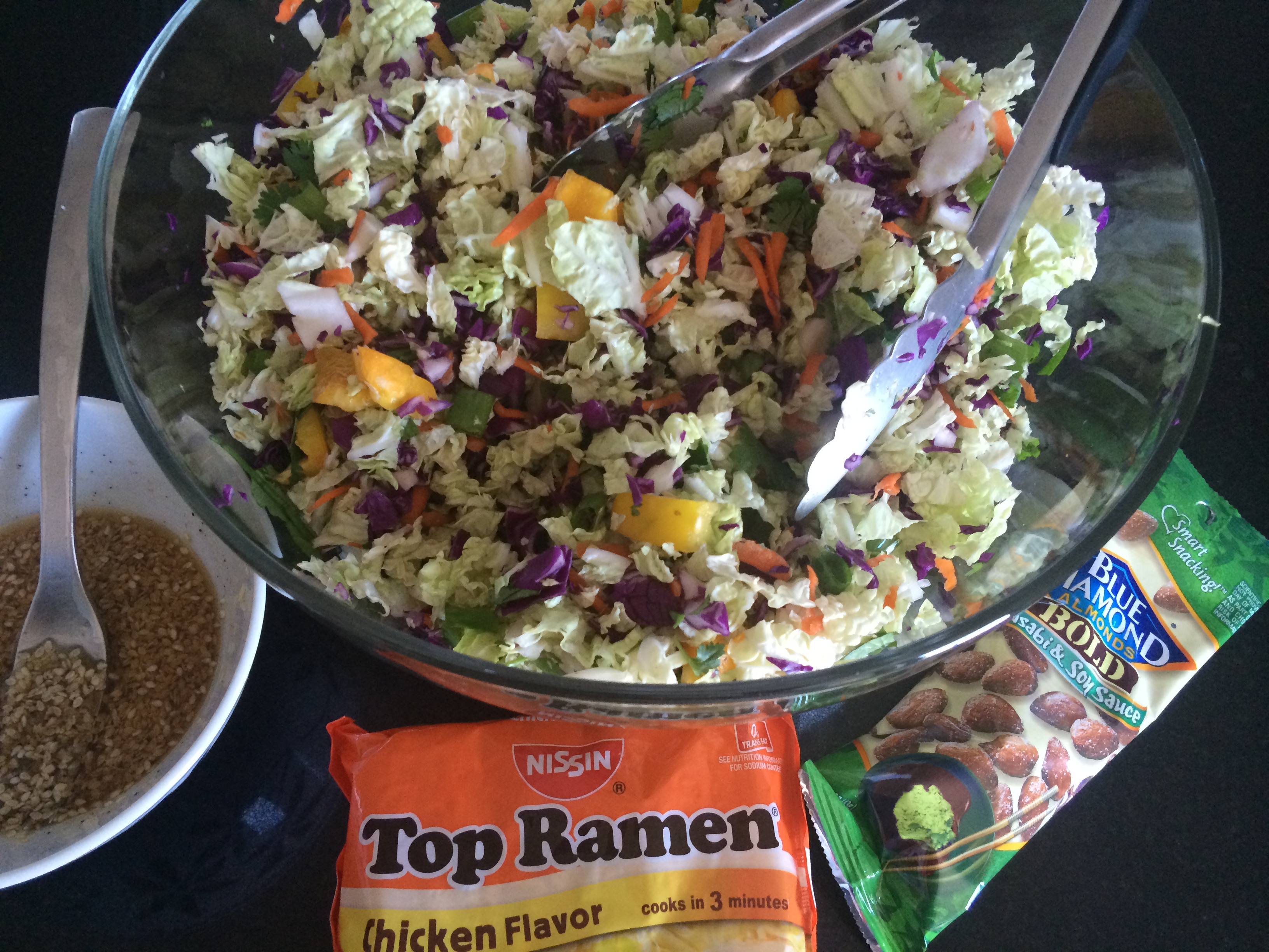 I make my famous Chinese Ginger-Sesame Salad two or three times a week. I chop up a yellow bell pepper, two green onions, cilantro, a carrot, a head of napa cabbage, some purple cabbage, a tangerine, a bag of crushed Top Ramen, and a bag of crushed roasted almonds, all by hand. It takes a while, but it’s worth it. I make the dressing with minced ginger and garlic, lemon juice, rice vinegar, toasted sesame seeds, salt, pepper, 10g of sugar, and 15g of toasted sesame oil.