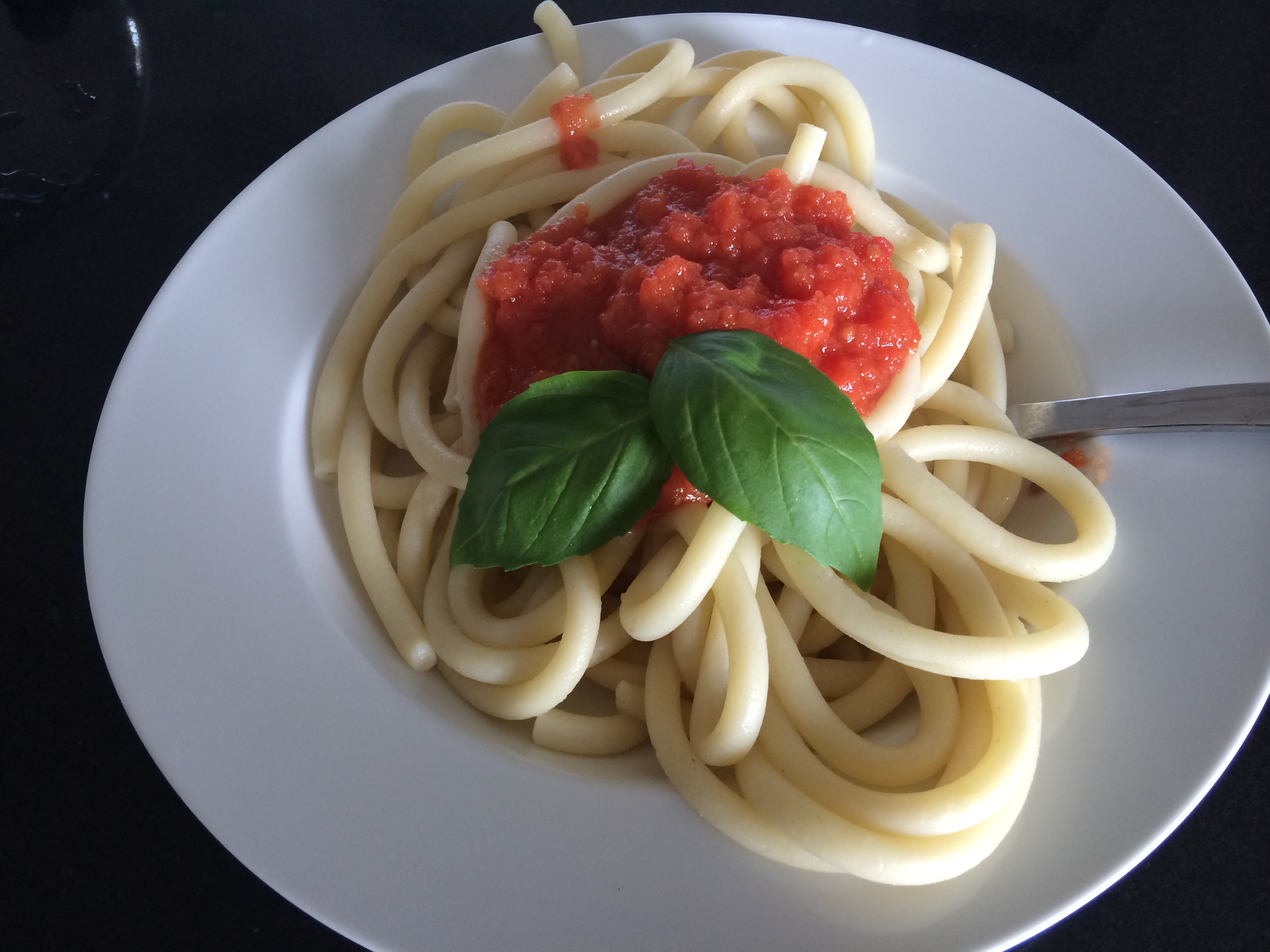 I was hungry for a big plate of pasta today, so I headed down to Assenti’s to pick up some fresh noodles and roma tomatoes. I made the sauce the traditional way (blanched the romas and removed the seedy part; puréed them, and fried it up in olive oil seasoned with garlic and fresh basil). I ate 200g of the pasta, which probably totaled around 500 calories. The thick, doughy noodles really hit the spot. If you don’t know by now, this is how I lose weight.