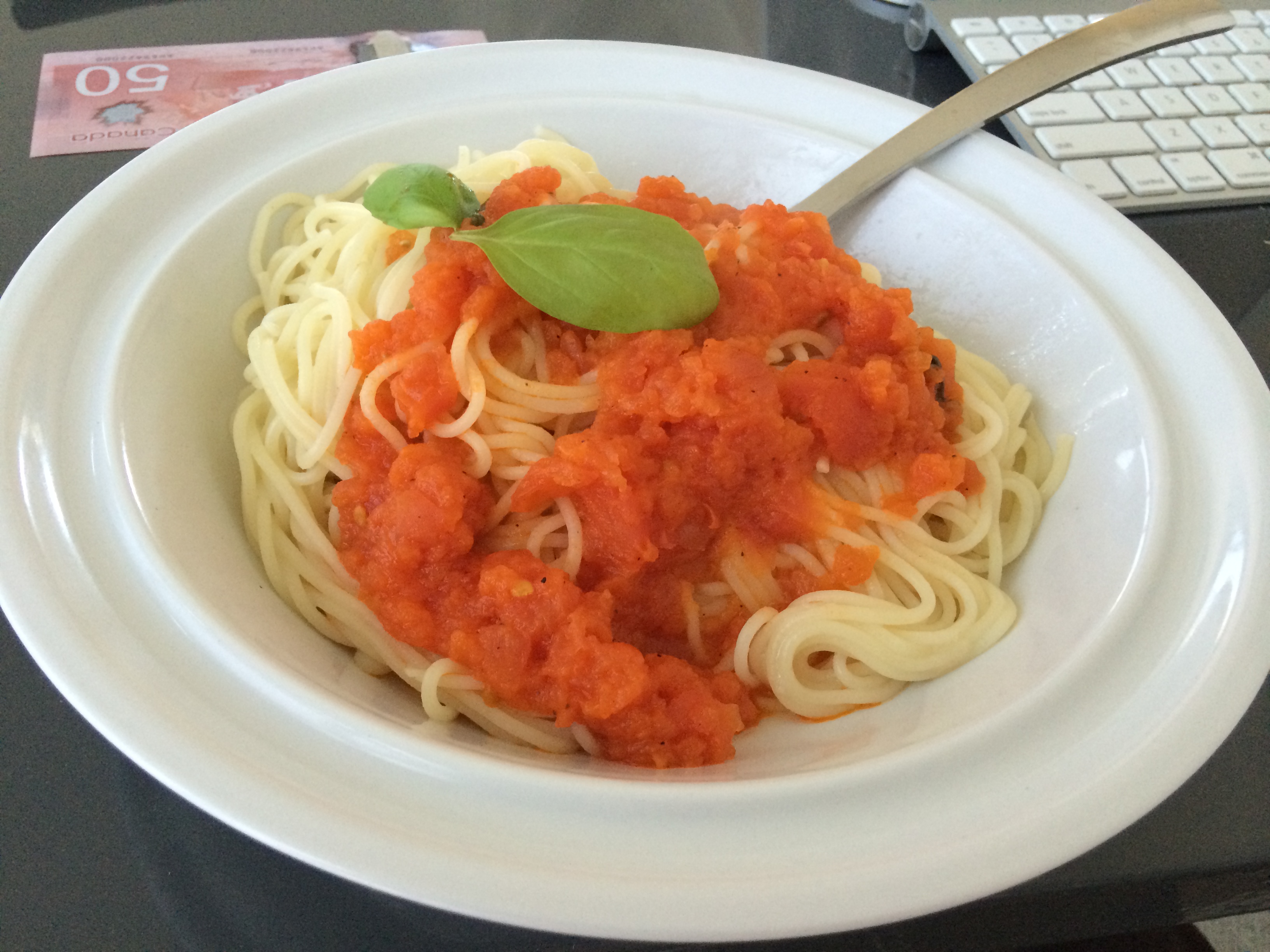 I picked up 500g of fresh spaghetti from Assenti’s on my way back from spin class. I made traditional Spaghetti al Pomodoro, using some olive oil, garlic, and fresh basil. I ate 250g of the spaghetti, but I’m still hungry. I’ll probably pick up another 3 lbs of corn tortillas from Gabriel’s. Or maybe I’ll get a veggie burrito from Taco Rey on 4th. Or maybe I’ll just eat the other 250g of spaghetti. I’m not sure. All I know, is I’m still really hungry.