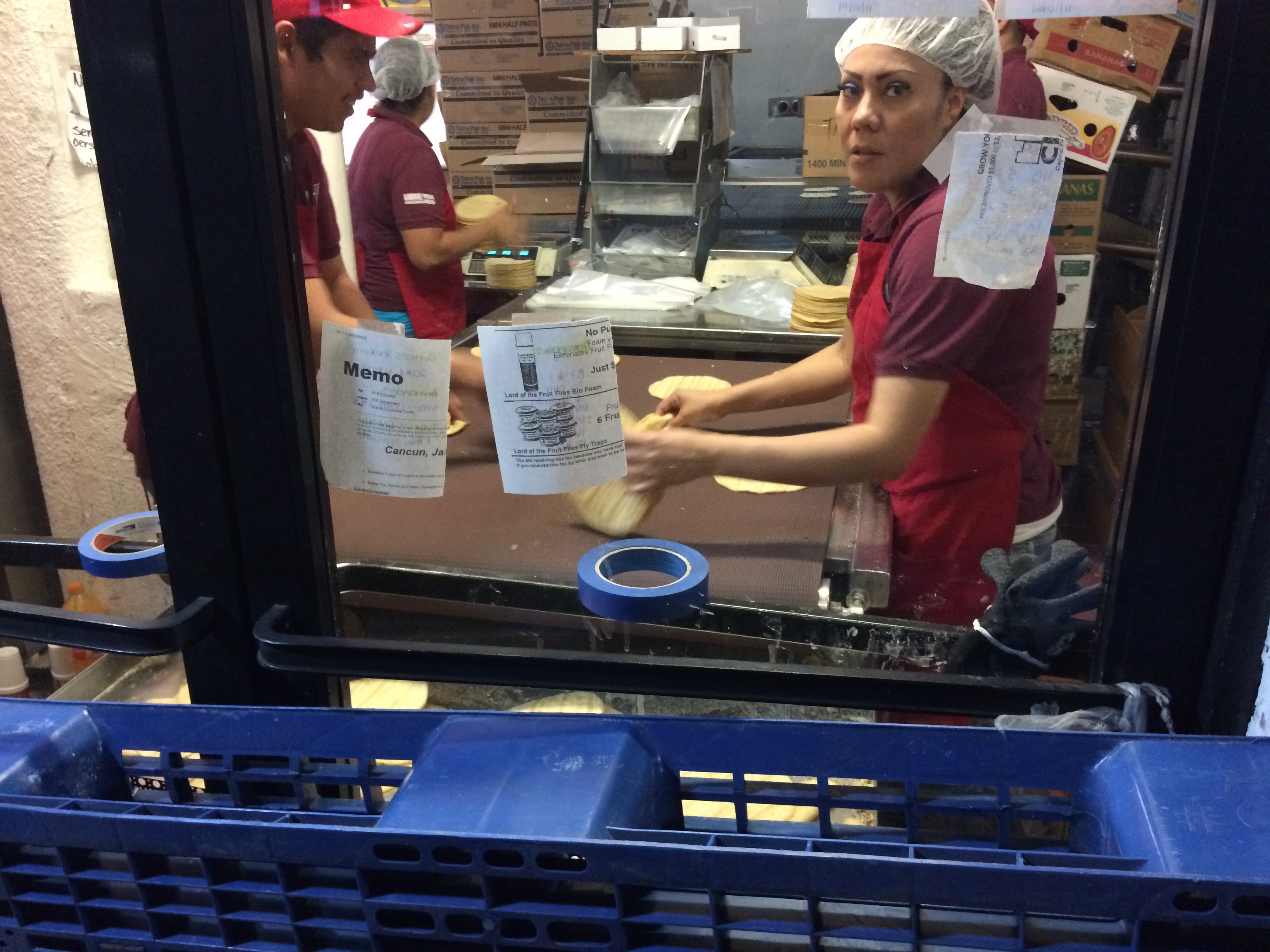 IMG_2144Every three days or so, I run out of tortillas, and I make a run to Gabriel’s on 25th & Imperial. It’s always open, as they’re making tortillas around the clock for stores and restaurants. The assembly line is right behind the counter, where they stack and package the tortillas that come off the machine. They keep some bagged tortillas in an insulated box, so if they can’t give you a bag right off the line, they still have warm ones for you.